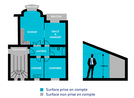 « Surface de planchers des locaux clos et couverts après déduction des surfaces occupées par les murs, cloisons, marches et cages d’escalier, gaines, embrasures de porte et de fenêtres. A l’exclusion des surfaces des parties des locaux d’une hauteur inférieure à 1.80 mètres ».